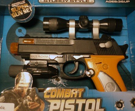 Pistoletas su optiniu taikikliu, šviečia bei skleidžia garsus. Baterijos yra integruotos į pistoletą. Pistoletas turi optinį taikiklį.