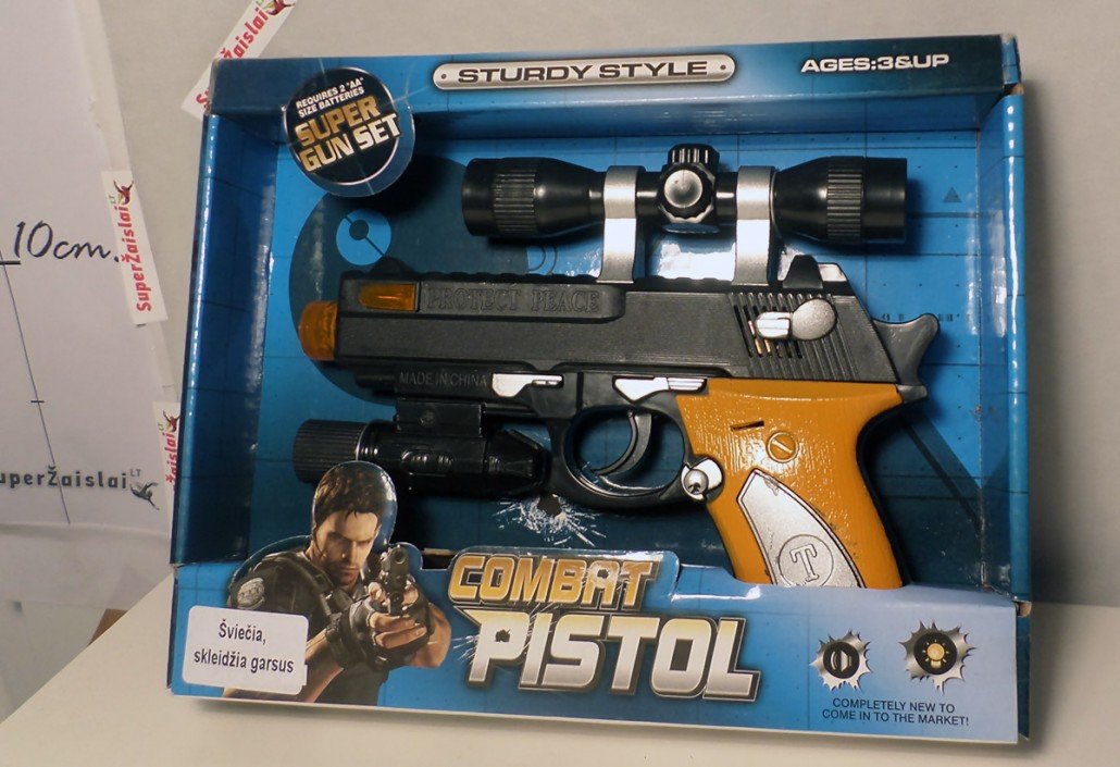 Pistoletas su optiniu taikikliu, šviečia bei skleidžia garsus.